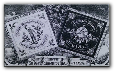 So half uns der Zufall weiter, als im Jahr 1991 die historische Vereinsfahne von 1924 wieder auftauchte. Zur damaligen Fahnenweihe war es üblich, dass die befreundeten Nachbarvereine der neuen Fahne ein kleines Ehrenschild spendeten, welches auf den Fahnenstiel genagelt wurde. Und auf genau solch einem kleinen Messingschild wurde dem Schützenverein Sylda zur Fahnenweihe "im Jahre 105 nach Gründung" gratuliert. Somit rechneten unsere Chronisten ausgehend vom Jahr 1924 einfach 105 Jahre zurück und legten das Gründungs-