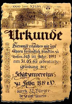 brochenen DDR haben auch im Syldaer Verein ihre Spuren hinterlassen. Die Chronik ist verschwunden, die Schützenkette und die alte Fahne (von 1819-1924) sind unauffindbar. Doch all dies konnte die Mitglieder des am 1.6.1991 wiedergegründeten Vereins in ihrem Willen nicht beeinträchtigen. Mit großer Begeisterung und Initiative errichteten sie einen neuen Schießstand. Unzählige Arbeitsstunden und enormer Fleiß der Schützen waren nötig, um optimale Bedingungen zu schaffen. Neben dem Schießstand existiert noch ein schönes Schützenhaus. Eine besondere Aufwertung erfährt dieses Jubiläum durch die Schirmherrschaft unseres Bundeskanzlers Dr. Helmut Kohl. Seine Anerkennung macht uns zu recht stolz auf Geleistetes. Wir als Schützen wollen mit unserem Engagement einen nicht unwesentlichen Beitrag zum kulturellen Leben in der Kommune leisten.