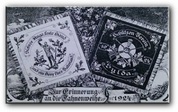 So half uns der Zufall weiter, als im Jahr 1991 die historische Vereinsfahne von 1924 wieder auftauchte. Zur damaligen Fahnenweihe war es üblich, dass die befreundeten Nachbarvereine der neuen Fahne ein kleines Ehrenschild spendeten, welches auf den Fahnenstiel genagelt wurde. Und auf genau solch einem kleinen Messingschild wurde dem Schützenverein Sylda zur Fahnenweihe "im Jahre 105 nach Gründung" gratuliert. Somit rechneten unsere Chronisten ausgehend vom Jahr 1924 einfach 105 Jahre zurück und legten das Gründungs-